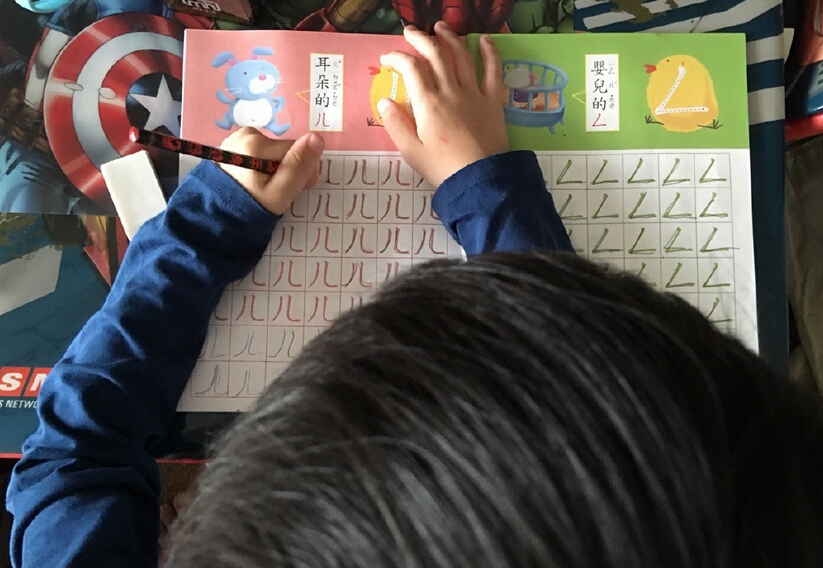 照片中,Kimi端正坐在书桌前,左手拿笔,描笔画,字迹工整,已经快完成两页作业纸。
