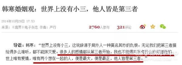 当年他和赵卓娜的绯闻传得沸沸扬扬,谈到“小三”问题,韩寒的说法是:“很多人的感情都是从第三者开始,我也不觉得共享有什么败坏道德的。”