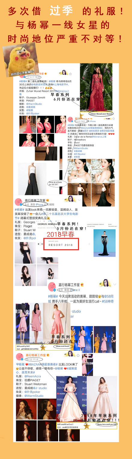 而且在她们的认知里,杨幂属于小花第一梯队的,时尚成绩特突出,不存在借不到衣服的情况,还专门罗列了一张表总结杨幂的时尚成绩。