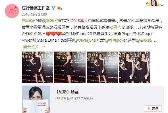 2016年参加嘉人盛典,杨幂还穿的还是Prada下一季早春新款(博文里“春夏”为错误,官方已纠正是“早春”)。