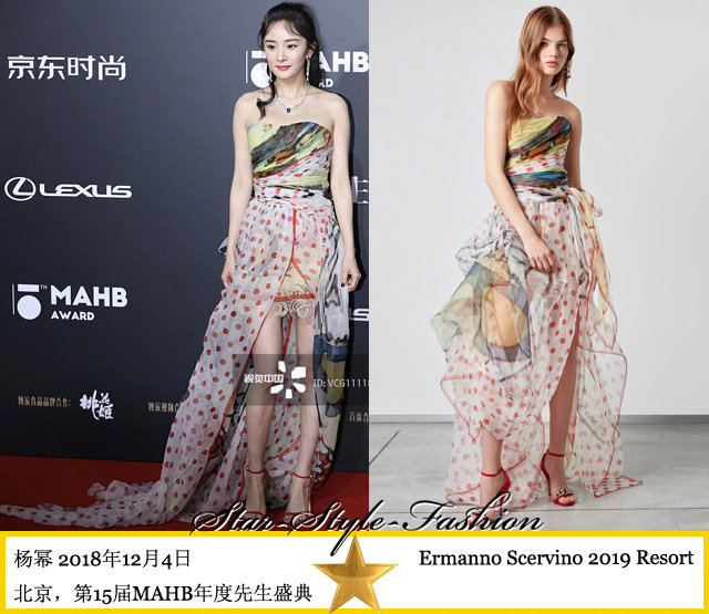 没有对比就没有伤害,今年确实有点虐。就在十几天前的时尚先生盛典,她身着Ermanno Scervino2019早春系列波点裙亮相,被网友吐槽像披了一层窗帘布出门。