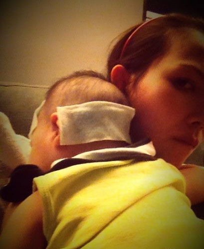 年仅半岁的“包子”脑袋上贴着退烧贴,安睡在蔡少芬怀中,让不少网友大呼蔡少芬是好妈妈。老公张晋在微博透露自己在片场拍通宵夜戏,也心疼表示很惦记妻女三人。![]()