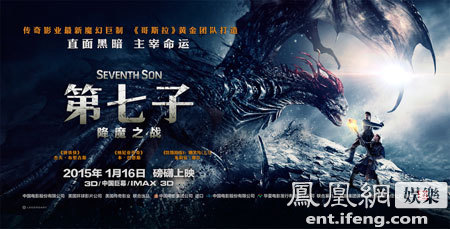 传奇影业出品的年度新魔幻巨制《第七子:降魔之战》确定将于1月16日在中国内地以3D、中国巨幕3D、IMAX3D的版本上映。这部电影是2015年开年第一部以中国巨幕3D和IMAX 3D双巨幕版本重磅上映