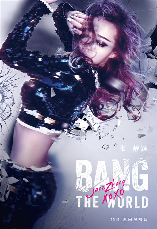 2015张靓颖“BANG THE WORLD”巡回演唱会双款海报再度由视觉艺术大师陈漫掌镜,已经合作多次的两人,默契十足。从张靓颖出道首张个人大碟的封面开启两人的正式合作,继《我相信》专辑、《改变》专辑、《第七感》专辑、《永远》单曲等众多完美合作后,两人携手缔造全新艺术作品,陈漫特立独行的视觉艺术与张靓颖的女性气质,令2015张靓颖“BANG THE WORLD”巡回演唱会双款海报震撼升级,张靓颖身着黑色珠片套装,小秀纤腰,在破碎的玻璃背景映衬下带来强烈视觉冲击。仿佛置身在迷幻世界中的张靓颖与神秘紫色光电融为一体,无时无刻不散发着女人的魅惑味道,顶尖的时尚触觉令人一目难忘,释放出无限想象空间,让人不由期待一场充满未知且即将到来的梦幻“视听”盛宴。耀眼夺目的主题“BANG THE WORLD”格外引人注目,口红书写的英文签名也充满女性韵味,性感呼之欲出。
