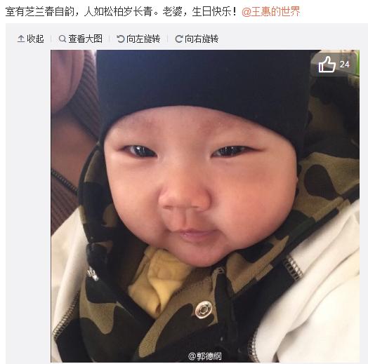 凤凰娱乐讯 今天(4月16日)晚上19点30分左右,郭德纲在微博上晒出三张图片,其中两张为郭德纲的妻子王惠与大儿子,此外,还有一张小孩的照片。照片中的小孩脸蛋肉嘟嘟的,眉眼间的申请像极了郭德纲,联系到