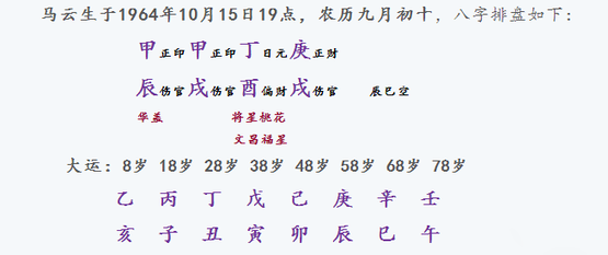分析:出生在丁酉日,丁火坐酉金为偏财,八字是偏弱的,财为忌神,酉金左右为戌土脆金,这种情况就是越克越有。在2014年甲午年,午戌半合火局克财星,公司上市了自己的身价也不停的上涨,一度成为中国首富。这个八字比较有意思,甲木为正印,为用神,所以马云的文化很高,是个英语教师。月令为伤官代表其人非常聪明,伤官生财是通过自己的智慧赚钱。这八字最好的就是以火为用神,他目前开发的阿里巴巴网络平台就是属火的,行业很适合他,所以成功了。马云没有发财的父母,也没有很好的后台,出生寒门,贷款创业,其貌不扬,能够成为中国的首富实则让人惊叹不已,这可是标准的横财命呀。