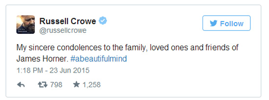 奥斯卡影帝拉塞尔-克劳发推悼念詹姆斯-霍纳
