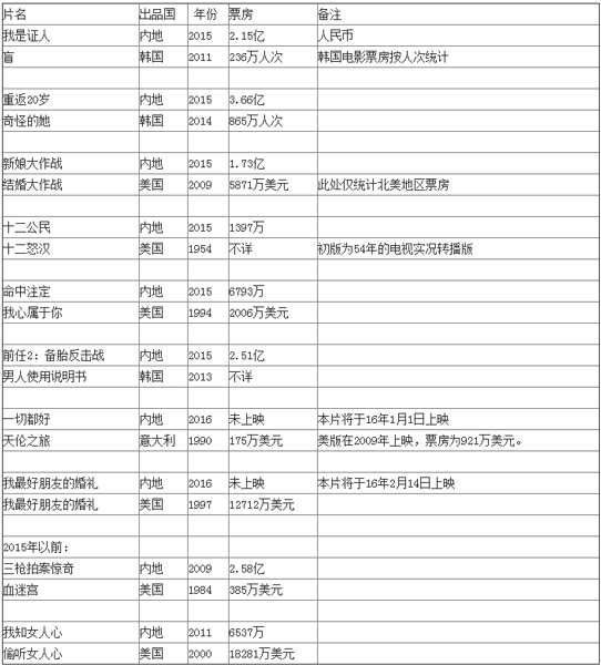 综述:2015年翻拍片众多 韩国美国各占半壁江山
