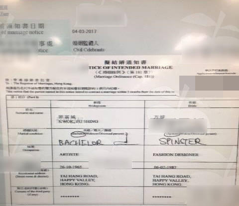 看这张结婚通知书,方媛报称未婚,职业是fashion designer(时装设计师),二人报称同住跑马地大坑道寓所。早前有消息指方媛已怀孕,如属实,郭富城这次真是双喜临门,可喜可贺!