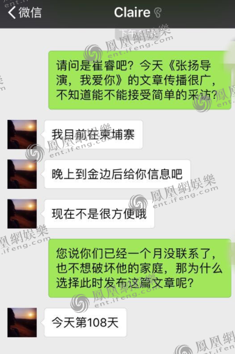 凤凰网娱乐记者第一时间联系了文章中的双方当事人。导演张杨本人的电话目前处于能接通状态,但多次拨打均被其挂断。文章作者90后女生崔某,则表示自己目前正在柬埔寨,她与张杨导演已经一个月没有联系,之所以选择现在发声是因为“今天是第108天。”她在长文中曾表示108这个数字与佛珠有关,在这108天里经历了一个爱情大劫与无数爱的小劫。对于是否担心会破坏到张杨导演的家庭,女孩则称“至于他的老婆看到了,那说明有人爱他,这是一件好事啊,说明她有一个优秀的老公陪在她的身边。”