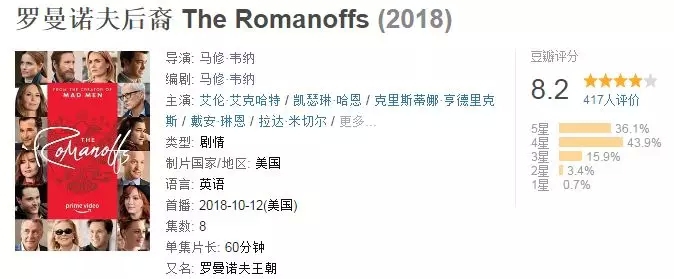 它就是,亚马逊出品,由《广告狂人》制作人马修·韦纳主创﹑执笔﹑制片﹑执导,首季8小时诗选剧《罗曼诺夫后裔》,已经于10月13日正式开播啦!(激动的搓手手)