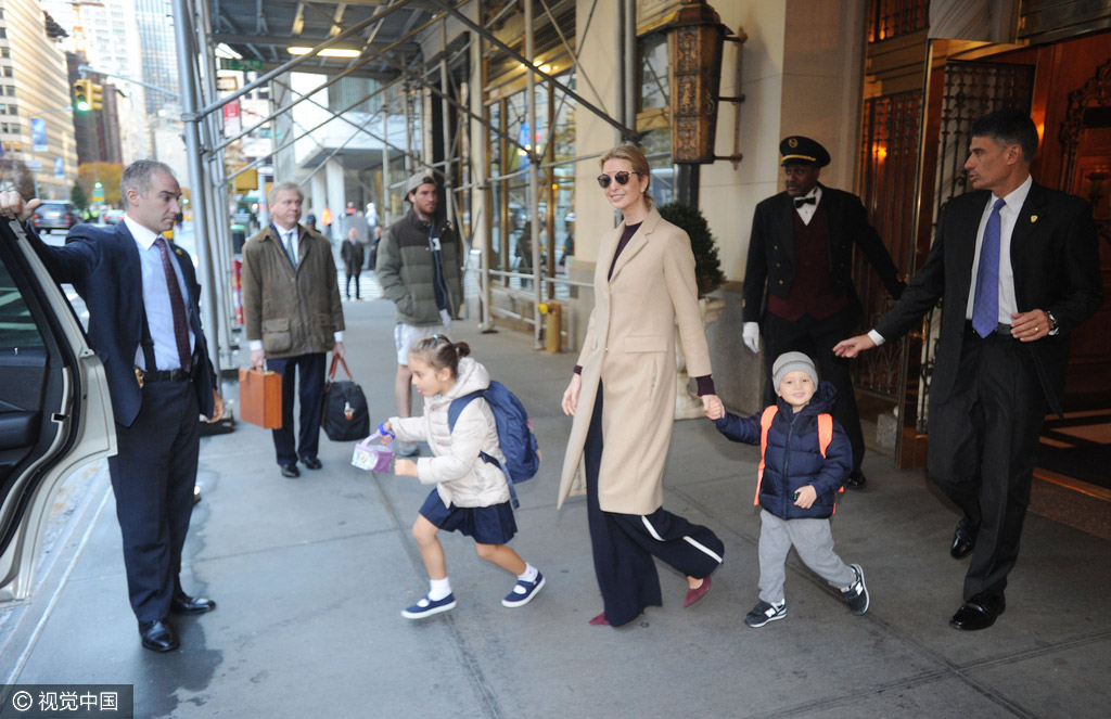 美国纽约,当地时间2016年12月1日,伊万卡·特朗普(Ivanka Trump)变身完美老妈,亲自送孩子上学。当天,伊万卡身穿驼色简约大衣,优雅时尚,笑容灿烂。小儿子见到镜头没有一丝害怕,面带微笑露出呆萌表情。
