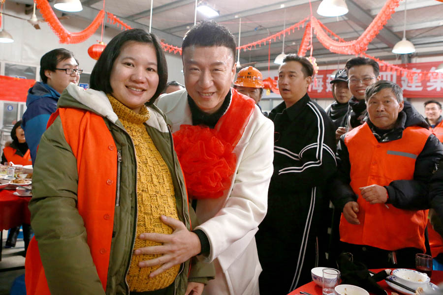 近日,《极限挑战》第三季第一期录制新春版特别节目,黄渤、孙红雷、黄磊、罗志祥、王迅、张艺兴和不能回家过年的建筑工人一起吃饭提前拜年。当天黄渤头戴安全帽高喊“工人师傅们辛苦啦”,十分暖心。一位怀孕的工人家属已大腹便便,孙红雷摸孕肚沾喜气,肚子里的小宝宝看来也十分幸运,还没出生就被“大腕儿”抚摸过了。(图文/视觉中国)