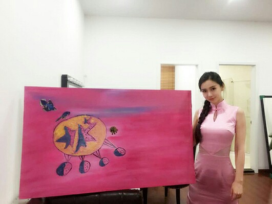 据香港媒体报道,刚刚荣升人母的Angelababy都一样,画一幅抽象画,就在慈善晚会上卖了18万高价。至于画的是什么,有网络红人琼姐表示,这幅画像细胞横切面,一看就知道Angelababy画的是受精卵。也有人说,画的像国旗,显示她的爱国心!其实,Baby亲自解释过,说这幅画是画自己对未来的想象,所以有一片粉色天空,中间的宇宙飞船同鸟儿就代表科技同生命。图为Baby与画作。