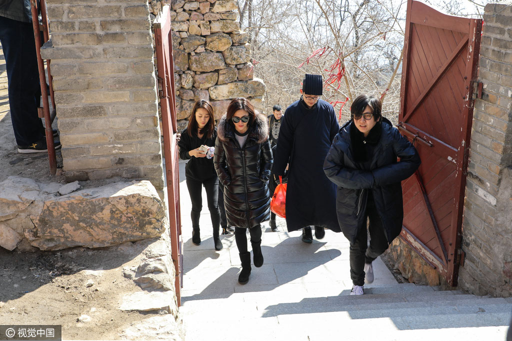 2017年3月12日,辽宁省丹东市,3月12日是老子诞辰2588周年纪念日。在3月10日和12日两天,关之琳、钟镇涛、姜育恒和方芳等明星以道家弟子的名义,与众多演艺界人士分两次来到辽东名山大孤山的千年古刹,祭拜老子、虔诚祈福。54岁的关之琳穿着厚重羽绒服上山,只见她淡妆出镜,皮肤有些松弛。