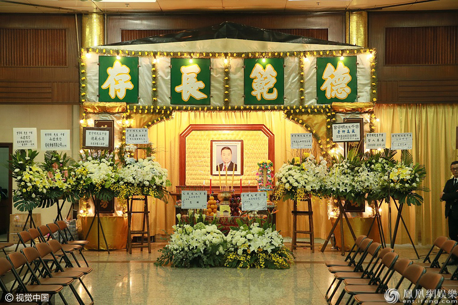 TVB资深演员曾守明上月于广州登台时,在台上晕倒猝逝。5月7日,其妻子和儿子在香港世界殡仪馆设灵,5月8日中午十二时出殡。灵堂正中横匾写上“德范长存”四字,曾守明的遗照用上电视剧的造型照。图为灵堂现场。(图文/视觉中国)