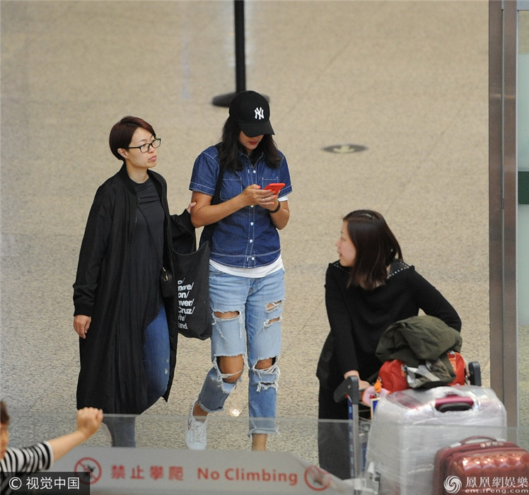 日前,昔日第一名模瞿颖身着破洞牛仔裤、头戴棒球帽现身上海机场,人群中穿梭无人识,一路手机热聊忙不停。(图文/视觉中国)/n
