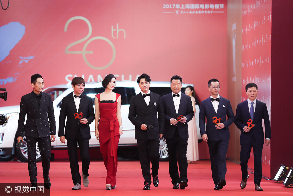 6月25日,上海,第二十届上海国际电影节闭幕红毯举行,许晴、朱茵、黄渤、秦海璐、段奕宏、余男、米拉·乔沃维奇、伊莎贝尔·于佩尔等中外影人盛装出席。图为《引爆者》主演段奕宏、余男、王景春、成泰燊等。