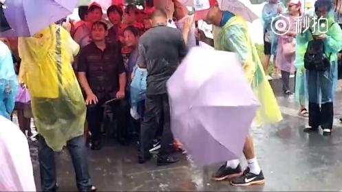 “大衣哥”和歌迷雨中合影 笑容灿烂全身湿透