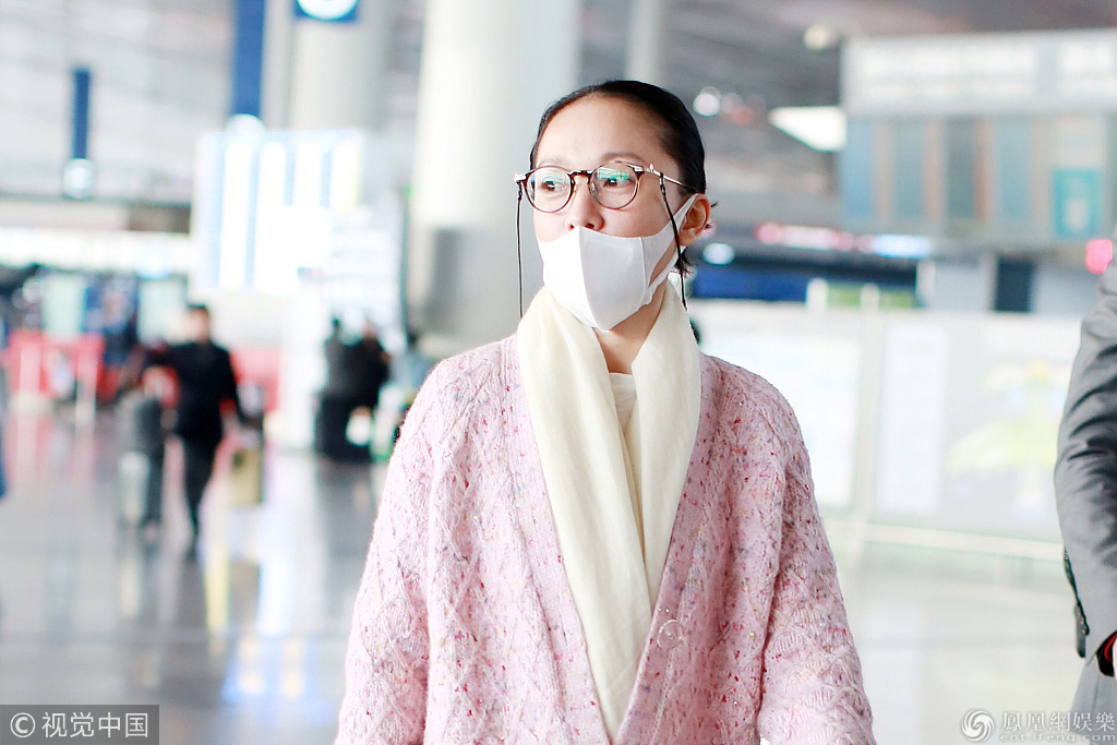 11月6日,北京,周迅现身机场,当天她戴着口罩,身着粉红色开衫素颜现身,粉粉嫩嫩,一副圆框眼镜更显文艺范,灵气十足。