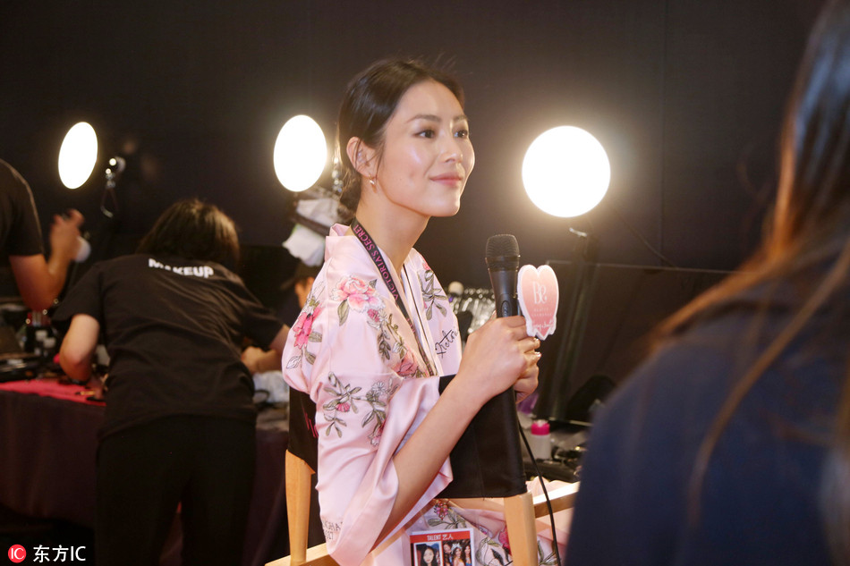 2017年11月20日,上海,2017维多利亚的秘密内衣秀后台,中国超模刘雯、何穗、奚梦瑶、雎晓雯、谢欣、陈瑜十分开心的拍照,看得出她们都非常兴奋。图为“大表姐”刘雯。