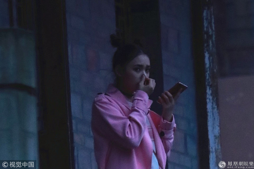 林允穿粉外套变“村花” 被冻得顾不上形象了