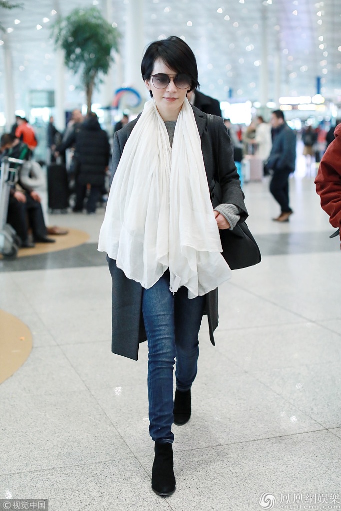 2018年3月5日,北京,俞飞鸿现身机场。她留着利落短发变身职场女强人,身穿牛仔裤和黑色大衣,戴着白围巾,整个人神清气爽利落干练。