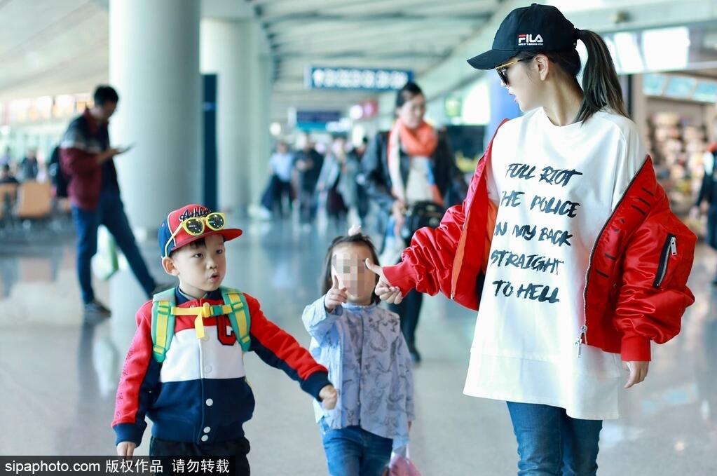 近日,何洁带儿子七宝和女儿宝妹现身北京机场。何洁潮装外套半脱,戴墨镜红唇抢镜,辣妈范儿十足。