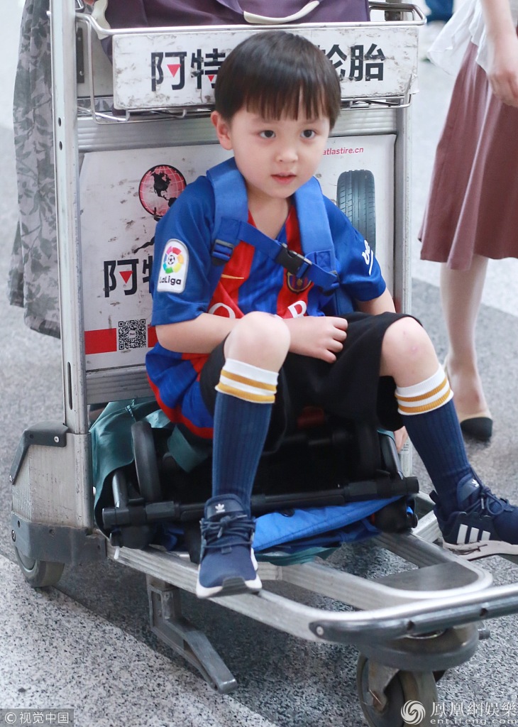 5月7日,北京,邓莎和儿子大麟子现身机场。大麟子穿一身巴萨队服,看来还是个小球迷。大麟子面对镜头,超有礼貌的挥手,外八的坐姿坐在行李车上,十分像少女羞涩呆萌。