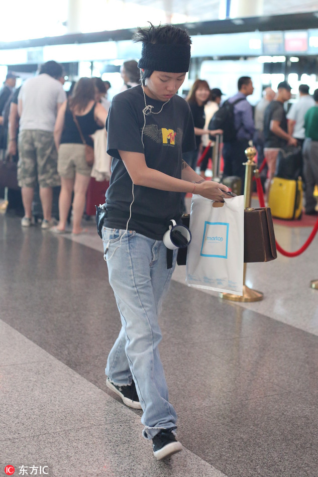 2018年6月28日,北京,窦靖童现身机场。窦靖童将杯子挂腰间是要引领新潮流? 发带扎头再现道明寺“凤梨头”。