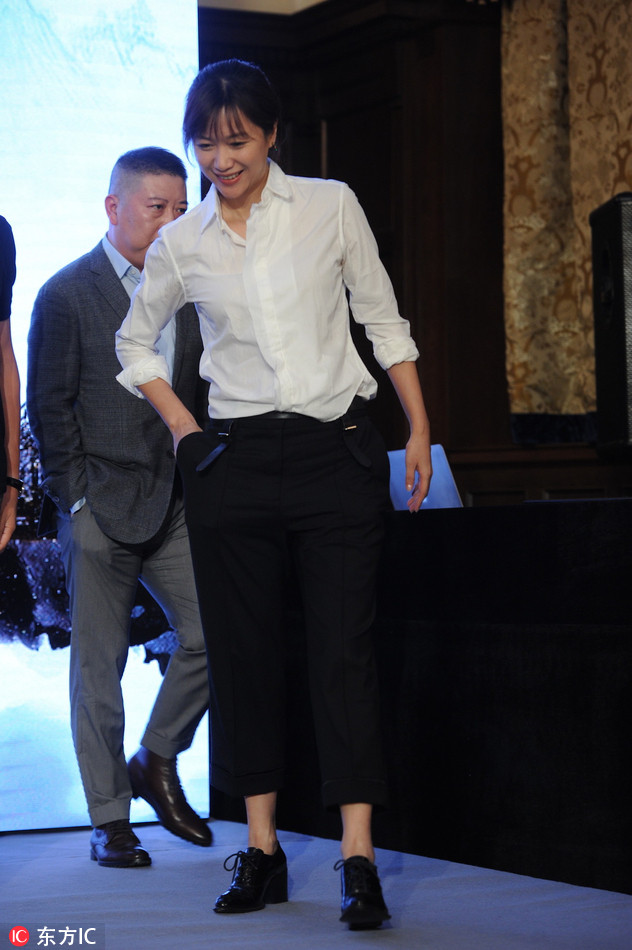 2018年7月6日,上海,徐静蕾艾美奖评委见面会。她身穿白衬衫造型干练,一副女强人风范气质迷人。