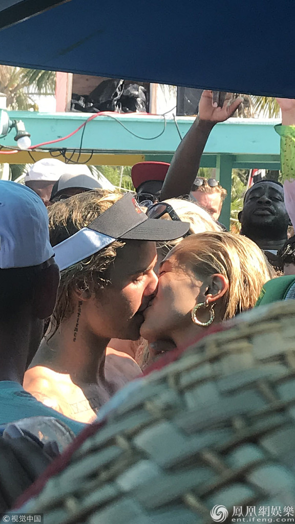 当地时间2018年7月9日,巴哈马,贾斯汀·比伯(Justin Bieber)和海莉·鲍德温(Hailey Baldwin)被拍在海滩庆祝他们订婚。比伯赤裸上身露纹身,和海莉·鲍德温在人群中热吻,高调示爱。
