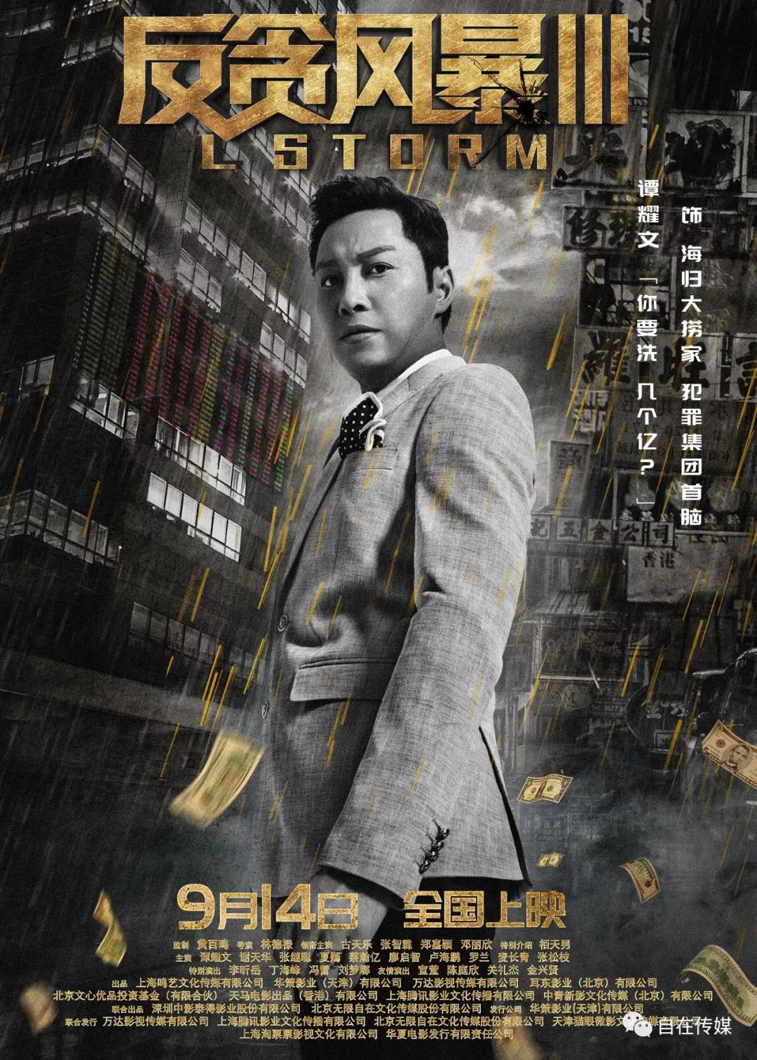 猛烈的“黄金雨”拍打着灰暗的欲望之城,金钱与欲望交织,人性与信仰对垒,古天乐、张智霖、郑嘉颖、邓丽欣、谭耀文、谢天华六大主演身陷泥淖,正邪莫辨。犯罪动作电影《反贪风暴3》于今日公开了一组角色海报,海报细节隐藏不少信息,角色台词更是预示人物命运。该片即将于9月14日全国公映。