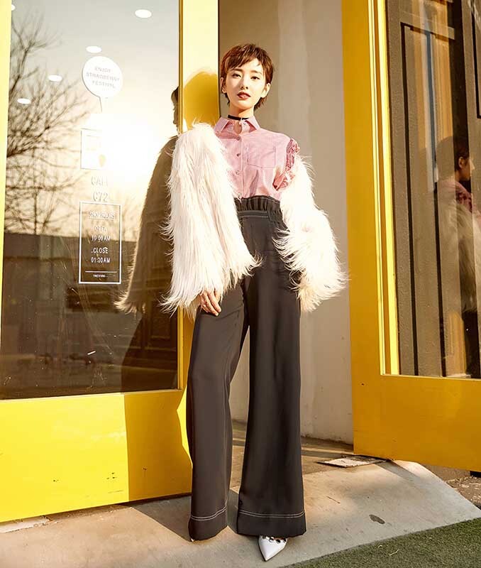 近日,演员许芳铱曝光一组时尚街拍,身穿粉色条纹衬衫,外搭白色皮草,可爱的同时又不失高贵。黑色高腰阔腿裤,搭配白色高跟鞋,更是凸显其性感长腿。身材比例满分,整体造型霸气十足。
