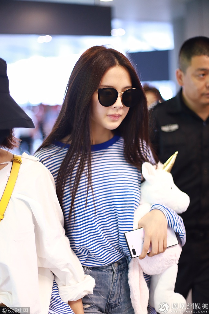 杨超越条纹衫搭热裤大秀美腿 机场获保镖护驾星味足
