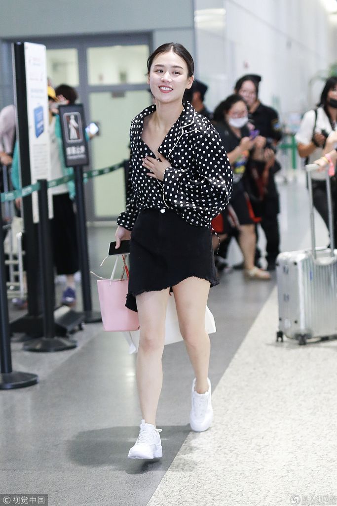 2018年9月6日,马思纯从上海机场飞往北京机场。她身穿黑色波点裙+牛仔短裤简单清爽,一路捂胸小跑赶飞机表情夸张成表情包。