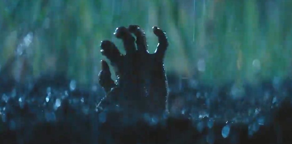 影片刚刚开始,伴随着轻缓的音乐,在雨夜的荒野里,一只手突然从泥泞中张开。