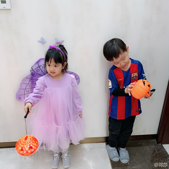 11月2日,邓莎上传一组大麟子和包贝尔女儿的合照,并配文称:“万圣节,你们吓着别人了吗?”照片中的饺子身穿紫色仙女裙,手拎南瓜灯,看起来十分可爱。大麟子身穿球衣,看起来十分帅气。俩萌娃一起玩耍,画面有爱。