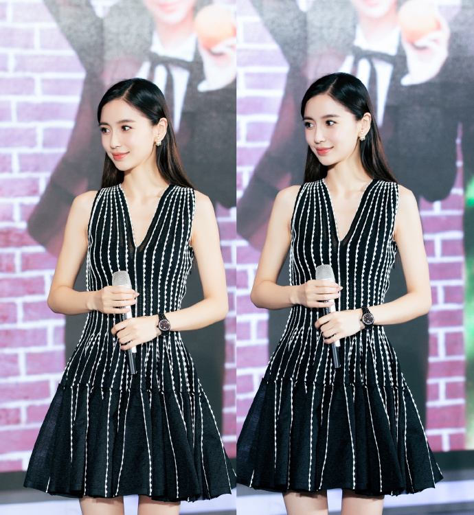 11月6日,工作室晒出Angelababy亮相某活动照片,她身穿带摩登条纹的精致黑裙,秀纤腰优雅翩翩,直发显清纯美如少女。