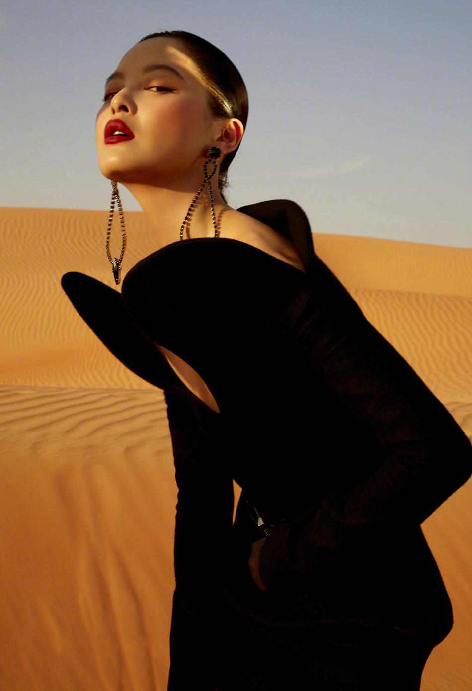 辛芷蕾上演异域风情拍沙漠大片 黑裙红唇展现独特魅力