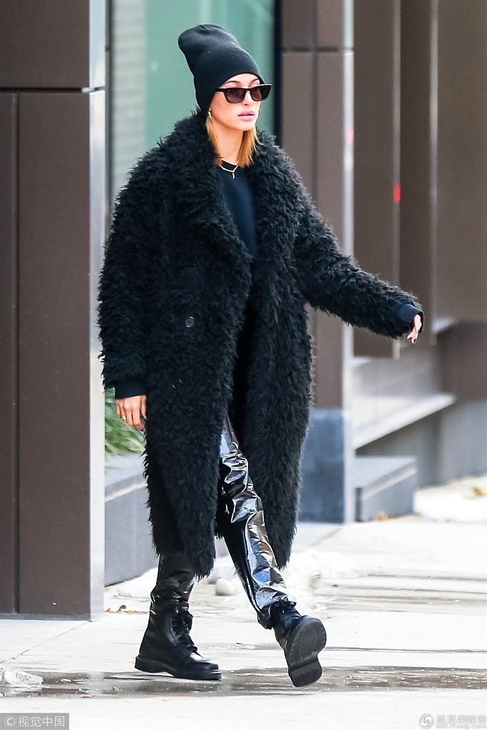 当地时间2018年11月17日,美国纽约,著名女星海莉·鲍德温(Hailey Baldwin)现身街头。她身穿黑色到脚毛绒大衣气场开挂,架黑超霸气外漏。