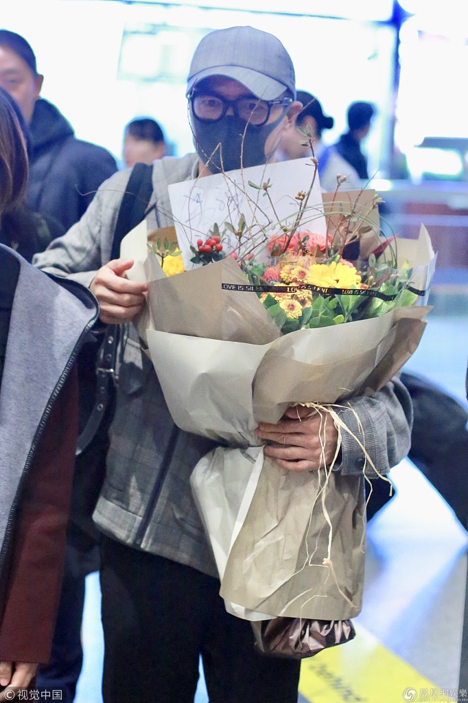 2018年11月19日,北京,段奕宏现身机场。向来走“老干部”风格的他这次头戴大耳机,外套半开,走起超酷型男路线,手捧鲜花一路和助理畅聊心情很好。