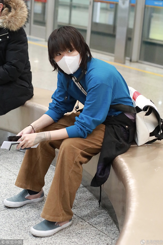 2018年11月21日,北京,窦靖童亮相机场,她口罩遮面素颜现身,坐在一边休息姿势霸气随性,手腕上的新纹身曝光,据悉这是韩国独立乐队hyukoh主唱兼吉他手吴赫为她纹上去的。