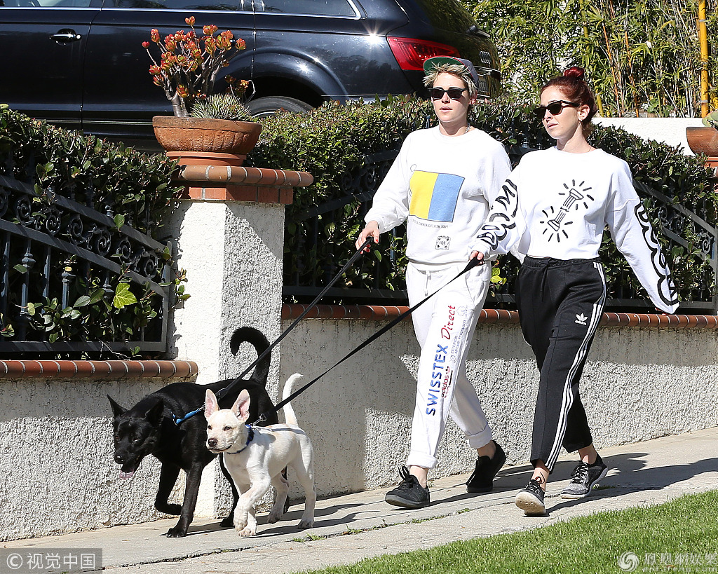 “暮光女”克里斯汀与女友遛狗 相视甜笑撒狗粮