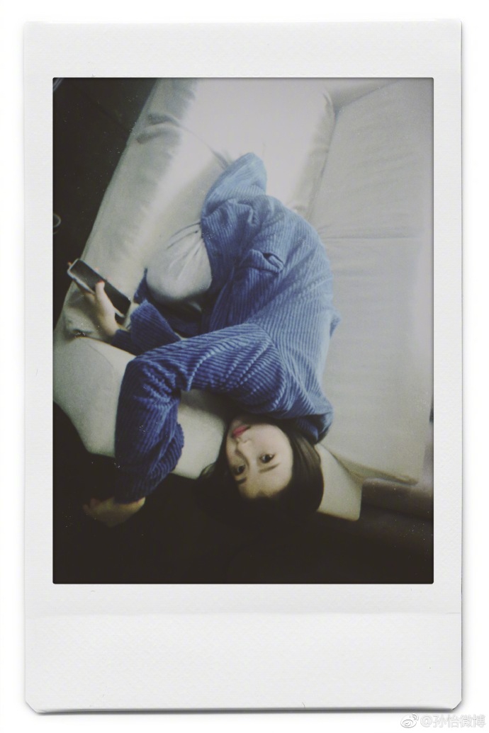 孙怡趴沙发拍照露甜笑 穿雾霾蓝大衣肤白貌美超养眼