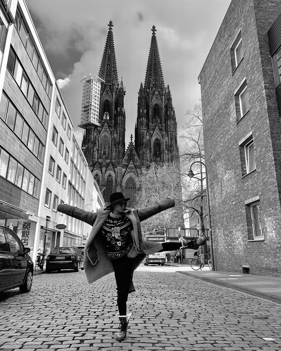 3月18日,昆凌社交网更新了一组在科隆大教堂前拍摄的美照,随后,周杰伦也晒出了一组同款照片,配文:“学你打卡”,照片中周董和昆凌身穿同款情侣装在同一地点打卡拍照。