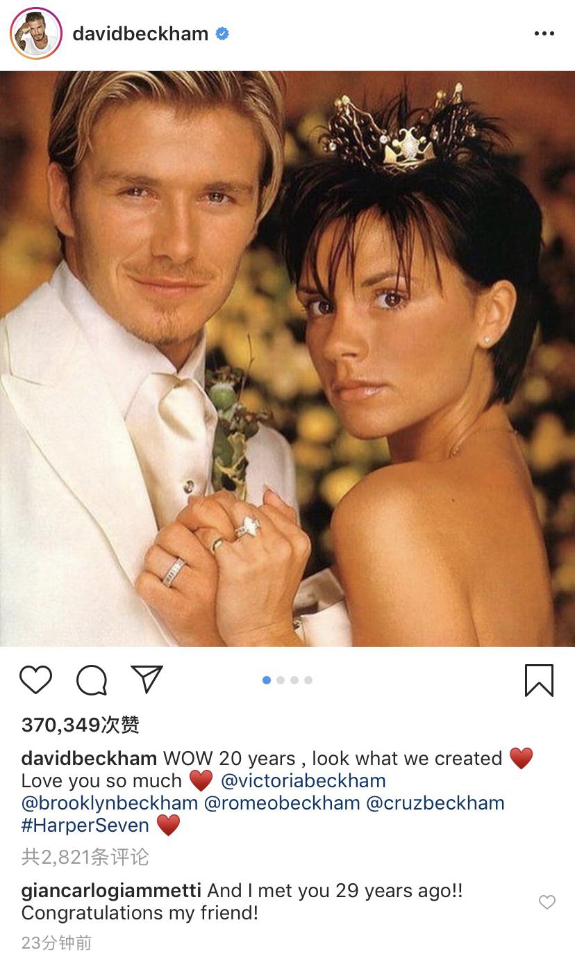 今日(7月4日)是贝克汉姆夫妇结婚20年纪念日,贝克汉姆在社交平台上发布旧照表白维多利亚。他写道:“哇哦,已经20年了,看我们共同创造的一切。很爱很爱你。”1999年7月4日,贝克汉姆和维多利亚在路特尔斯顿城堡庄园举行世纪婚礼。