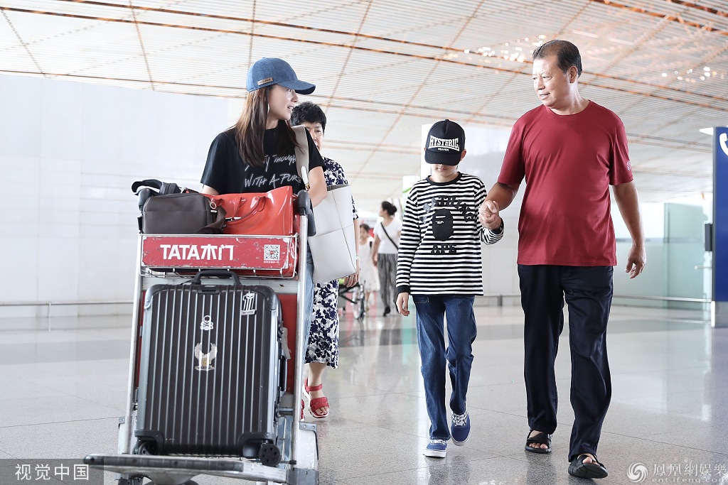 8月6日,董洁带儿子潘泽凯(顶顶)以及父母亮相北京机场。