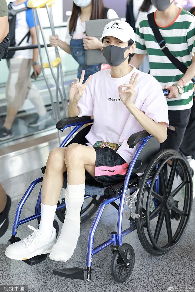 罗云熙拍戏受伤坐轮椅现身机场 与粉丝热聊不忘卖萌比耶