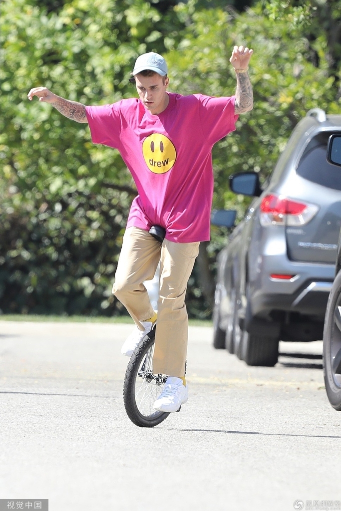 耍帅翻车!比伯街头玩独轮车,不慎摔倒姿势搞笑